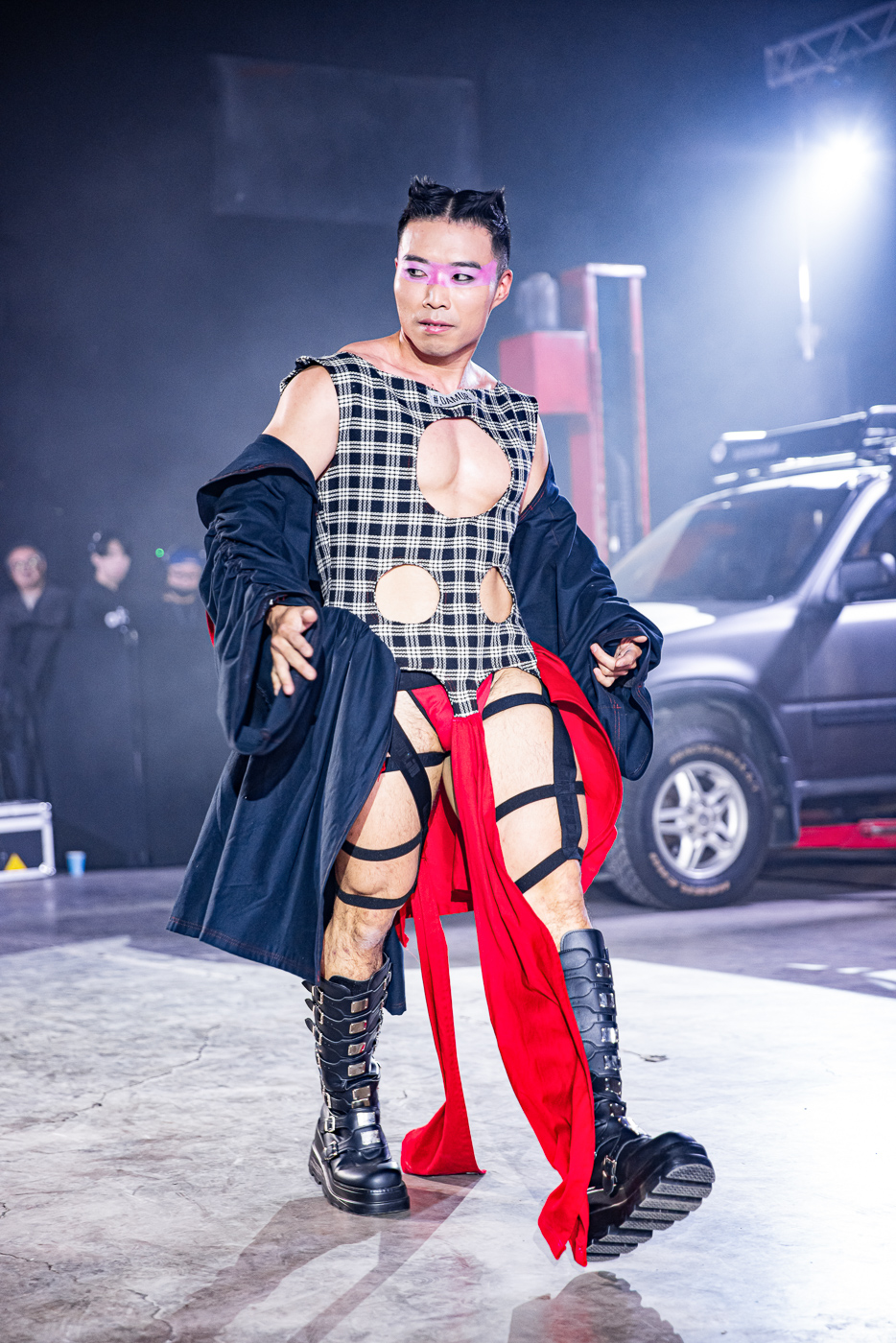 Die Bühne wird zum Schauplatz für ein intensives Zusammenspiel aus Go-Go Boys und Girls, die in maßgeschneiderten #Damur-Designs auftreten. Enge Schnitte, gewagte Cutouts und das markante Schachbrettmuster verkörpern die Dualität von Enthüllung und Verbergung. Leder-Accessoires wie Peitschen, Ketten und Masken verstärken das Bild eines Events, das gleichermaßen Macht und Verletzlichkeit thematisiert. Die Models tanzen, verschmelzen in ihren Bewegungen und kreieren ein visuelles Gedicht, das die Essenz von Freiheit und Selbstentfaltung widerspiegelt.