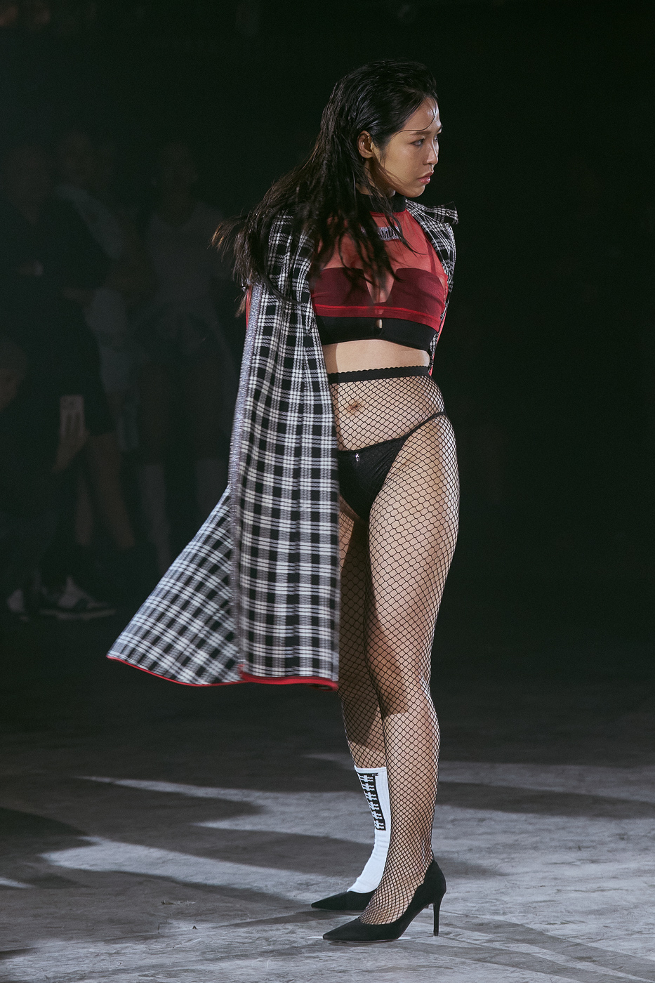 Besonders beeindruckend sind die Bühnenmomente, in denen die Models ihre Performance mit einer Mischung aus sinnlicher Verführung und wilder Provokation präsentieren. Der dramatische Einsatz von hydraulischen Liften, das Spiel mit Licht und Schatten sowie die intensiven Beats der DJs schaffen eine Atmosphäre, die den Zuschauer in den Bann zieht. Dies ist nicht nur eine Modenschau – es ist eine furchtlose Demonstration von Identität und Kreativität.