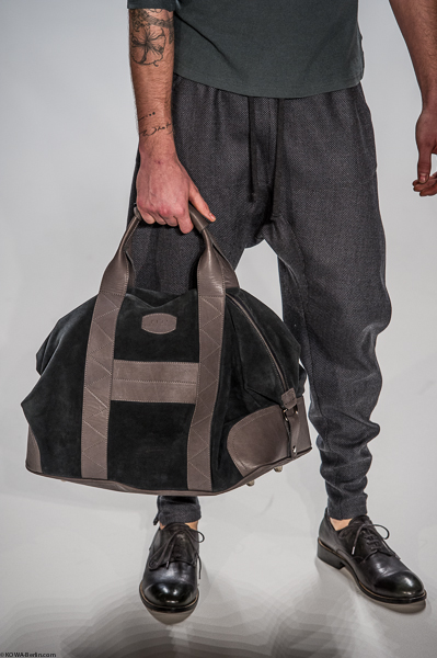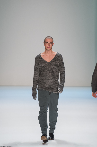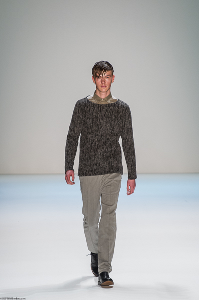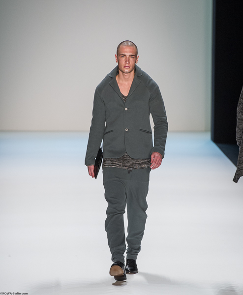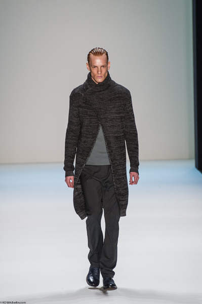 Verschieden geometrisch verarbeitete Details und Grobgestrickte Kleidungsstücke bilden einen Kontrast zu flächig farbigen Mänteln, Ärmeln und Hosen.